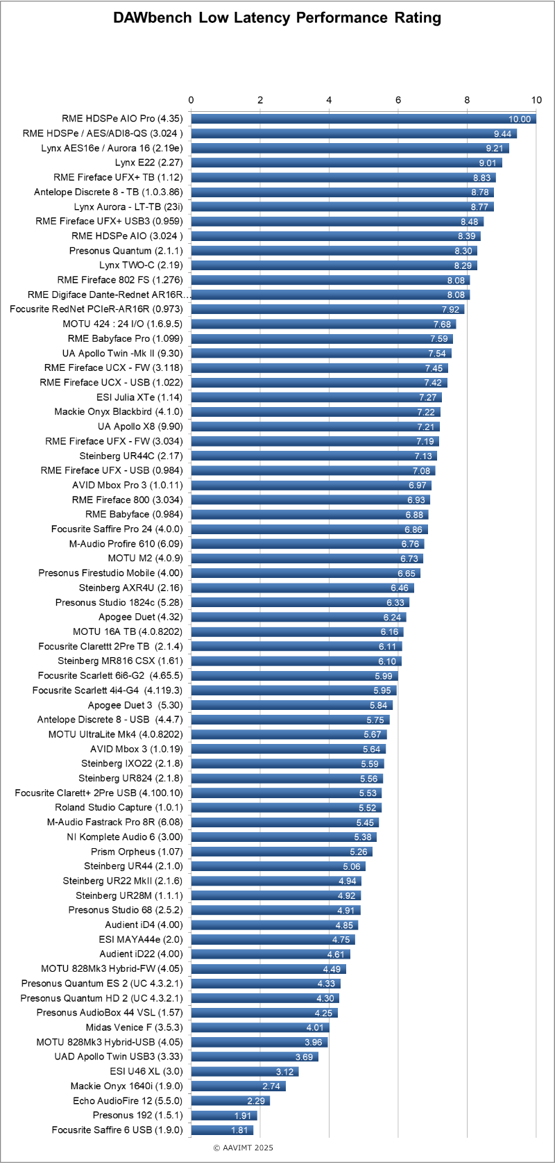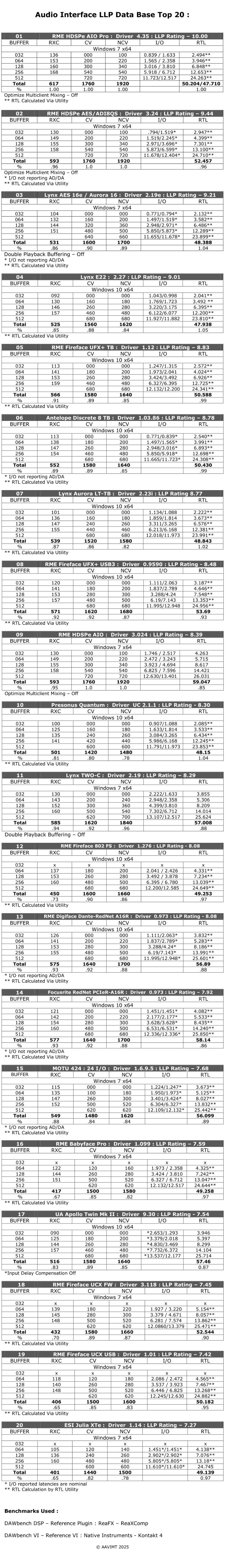 The delivered I/O and RTL has little relevance if the driver is inefficient at the preferred latencies, it is simply a number that can be quoted and bandied around, but is irrelevant when dealing with the actual end user experience if you cannot realistically use those lowest buffer settings. A perfect example ( and lets remove the 064/128/256 window dressings ) , some interfaces need 9+ ms of playback latency to perform equally to others at 4 ms in respect to number of plugins/polyphony on the benchmarks , this is the reality of the actual overall performance. This has nothing to do with delivered I/O and RTL latency, it is purely the efficiency of the driver evidenced by the fact that it takes more than double the playback latency to deliver equal performance of a better performing driver. Latency performance is more than just input monitoring / live playing.