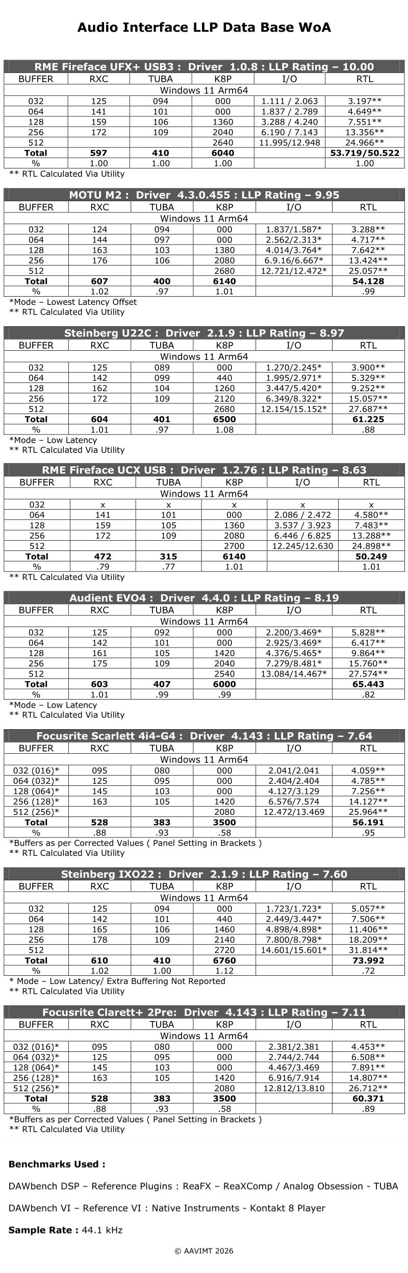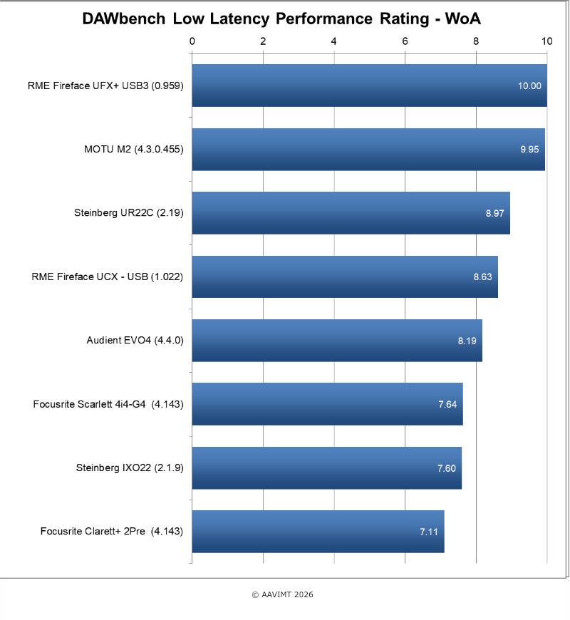 MOTU M2 : This is the latest entry ( March 2026 ) , and MOTU’s first run at a WoA native driver, and to say they have delivered is an understatement. Results close to on par or above in the respective benchmark sessions, with I/O and RTL rivaling the reference RME UFX+ USB3 reference interface. All round great performer.
